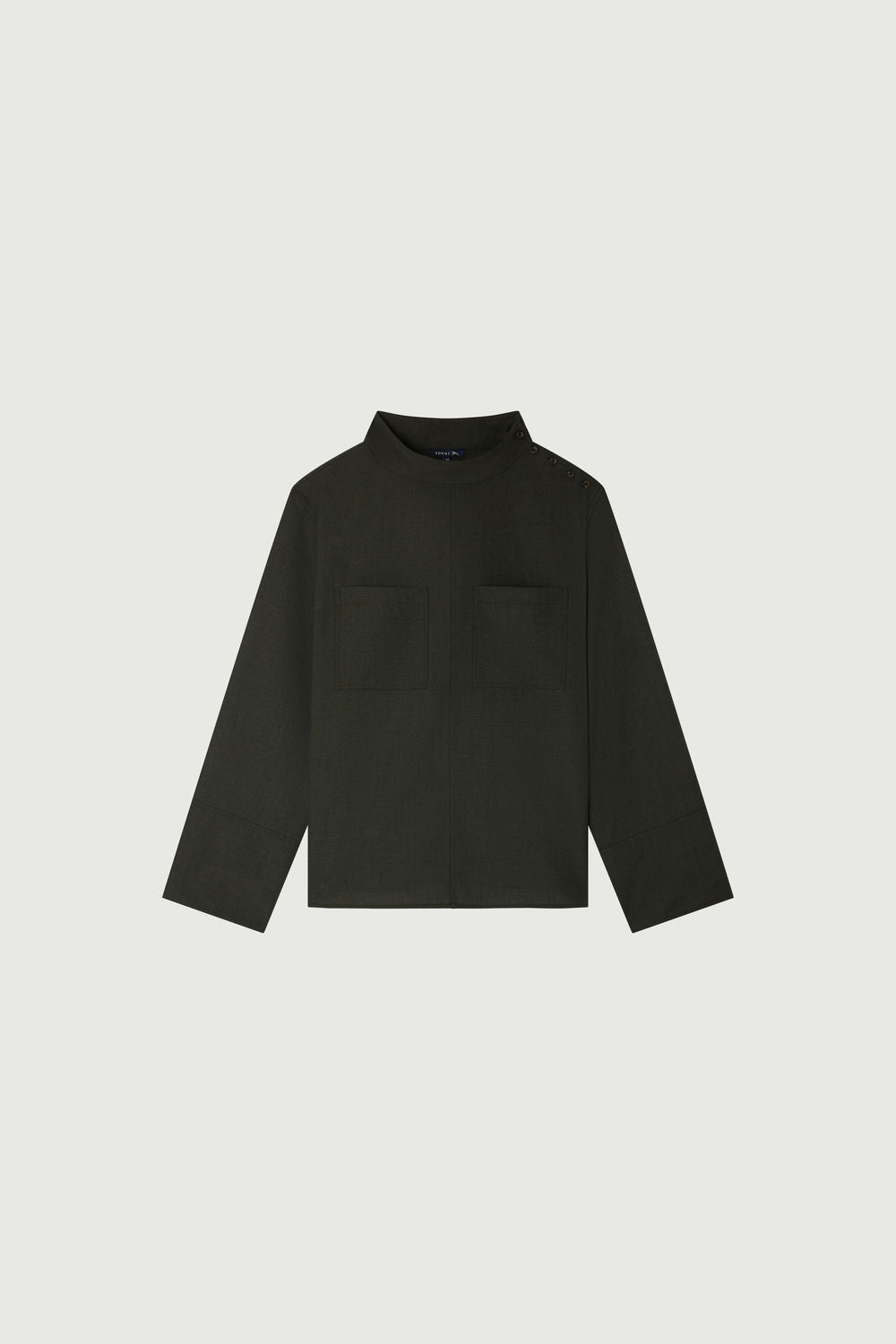 CANNES est une blouse en toile de coton laine. Avec sa coupe droite et ses manches très longues, et son col cheminé dégagé du cou, elle offre un style élégant et confortable.