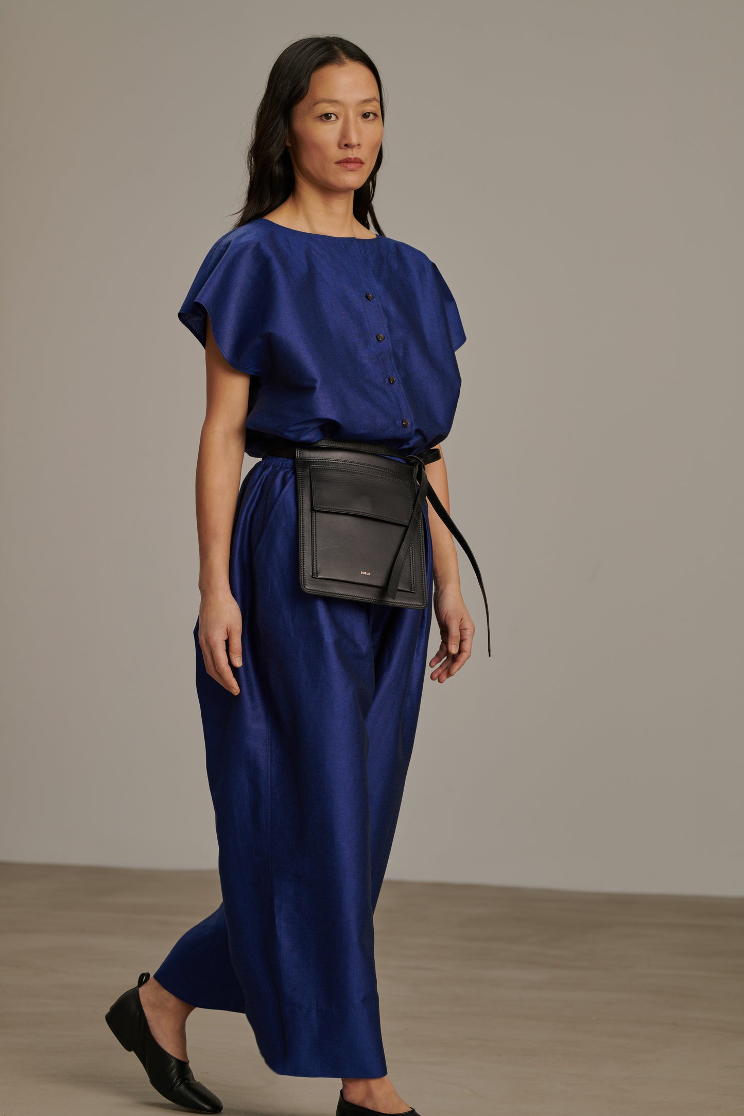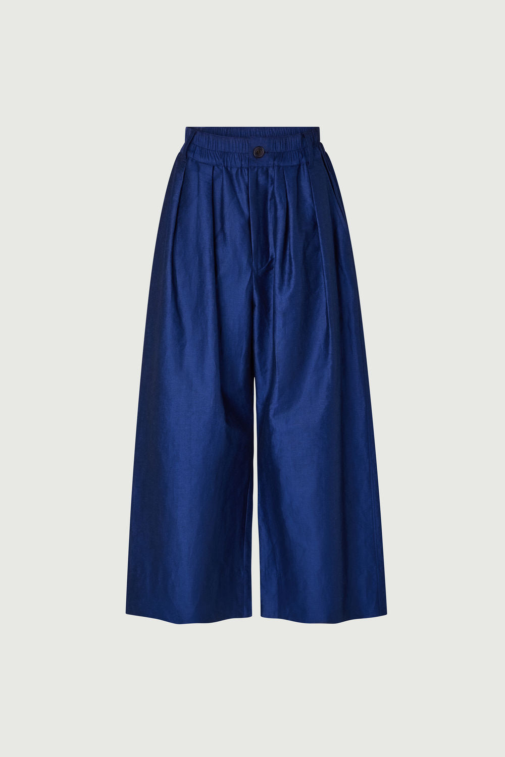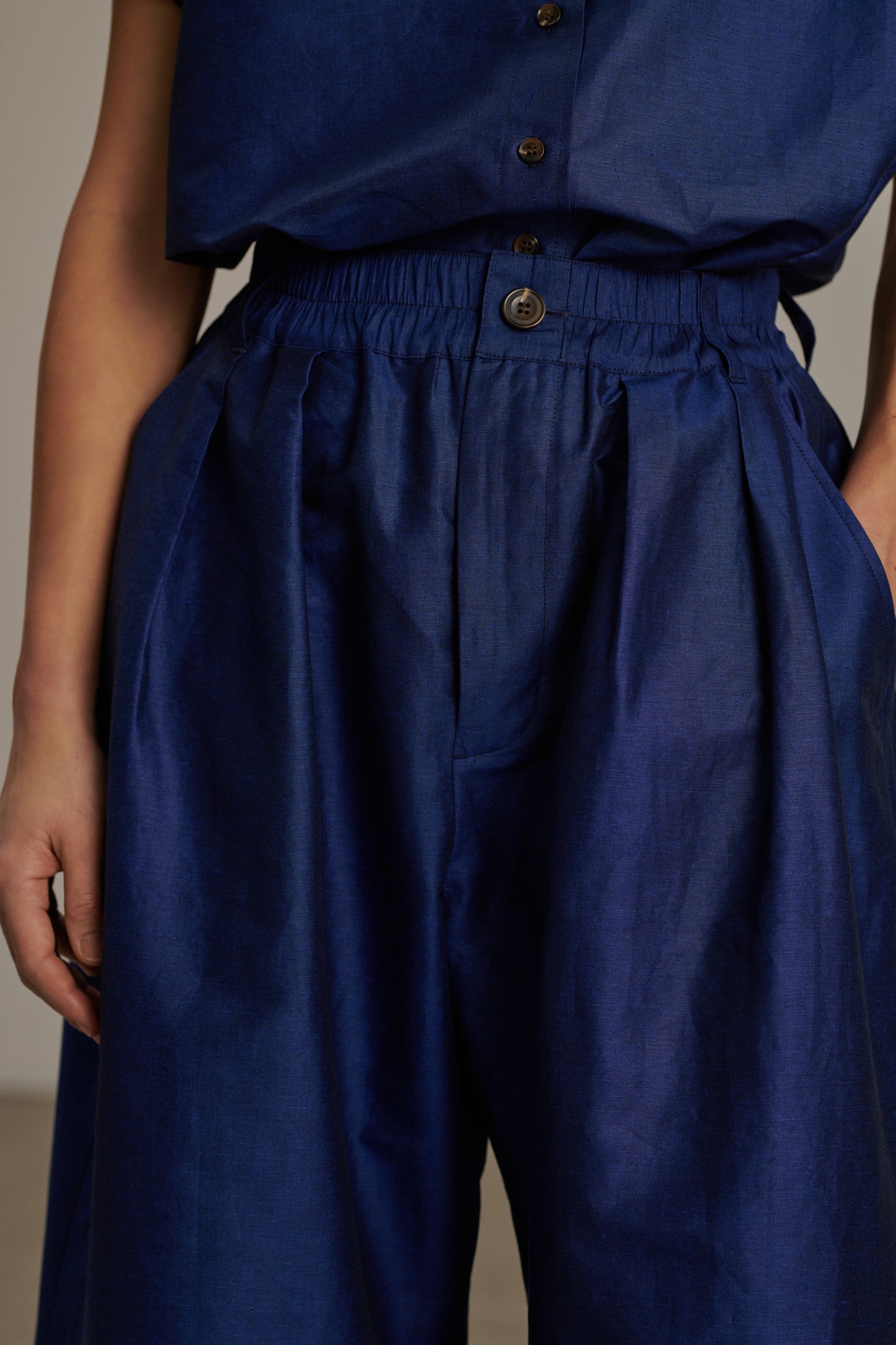 CAMERON est un pantalon ample, à la jambe arrondie. Sa matière est un coton-lin chintz, une matière habillée et légèrement brillante.