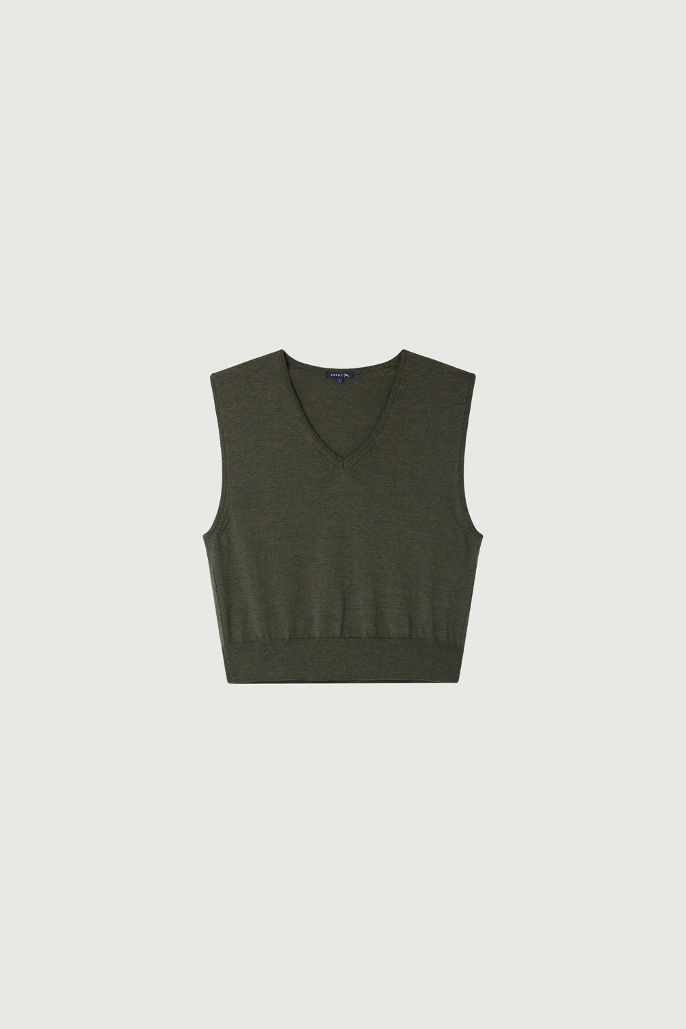 SONIA est un pull sans manches fin tricoté en laine mérinos, une valeur sûre de notre vestiaire. Simple en apparence, il se glisse en superposition dans toutes les silhouettes ou se porte à même la peau. La laine mérinos fine et souple révèle par l'intensité de sa couleur kaki profond.