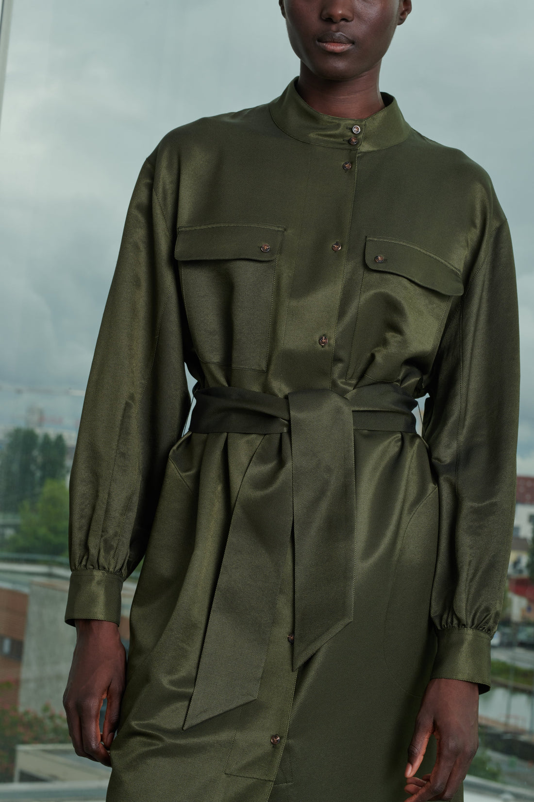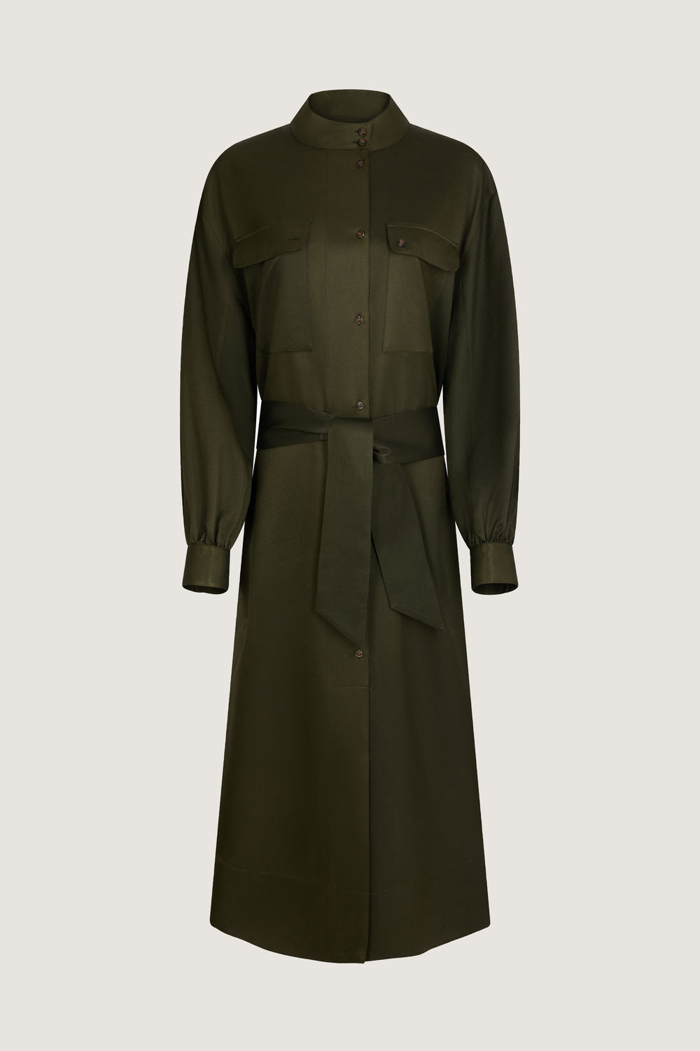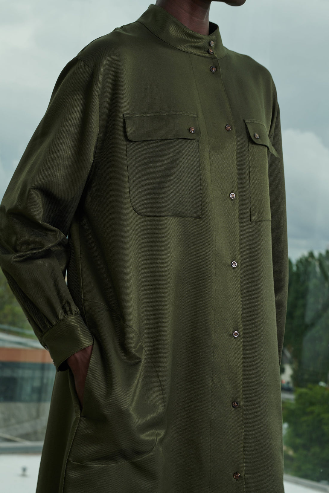 Robe col boutonné en soie et en laine - Coupe longue et droite- Col montant boutonné- Manches longues et bas de manches froncé- Ouverture devant boutonnée- Deux poches poitrine ouverture boutons