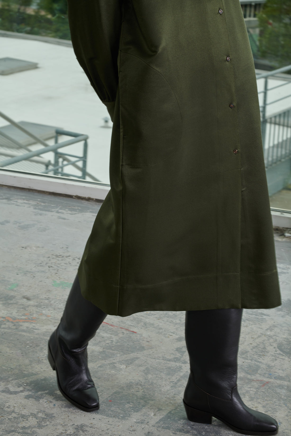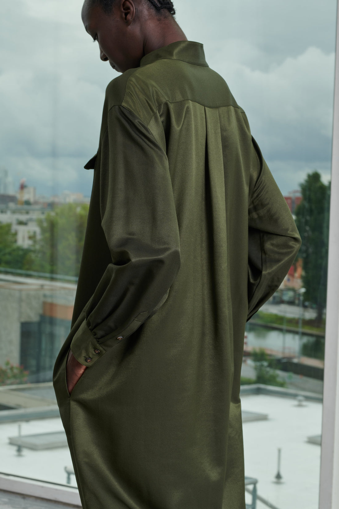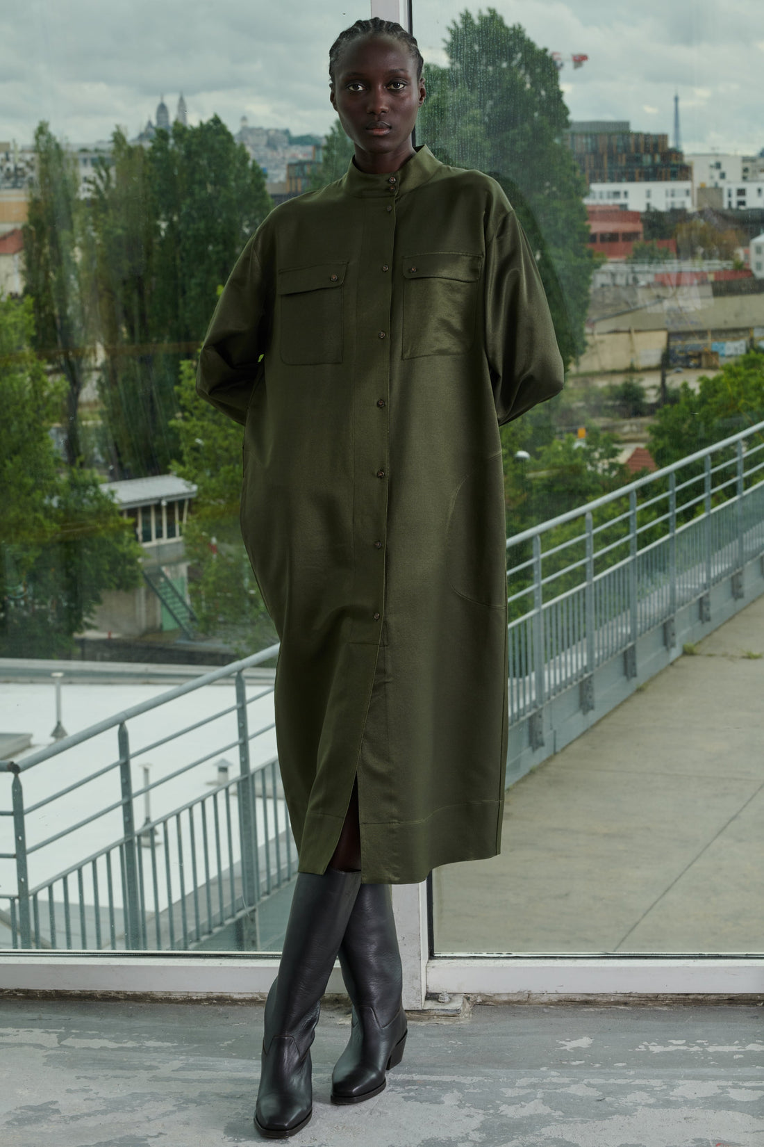 Robe col boutonné en soie et en laine - Coupe longue et droite- Col montant boutonné- Manches longues et bas de manches froncé- Ouverture devant boutonnée- Deux poches poitrine ouverture boutons