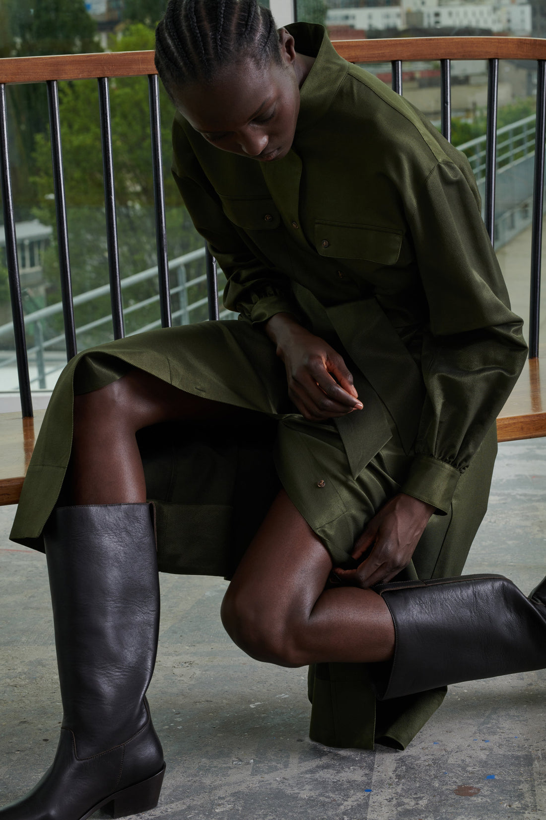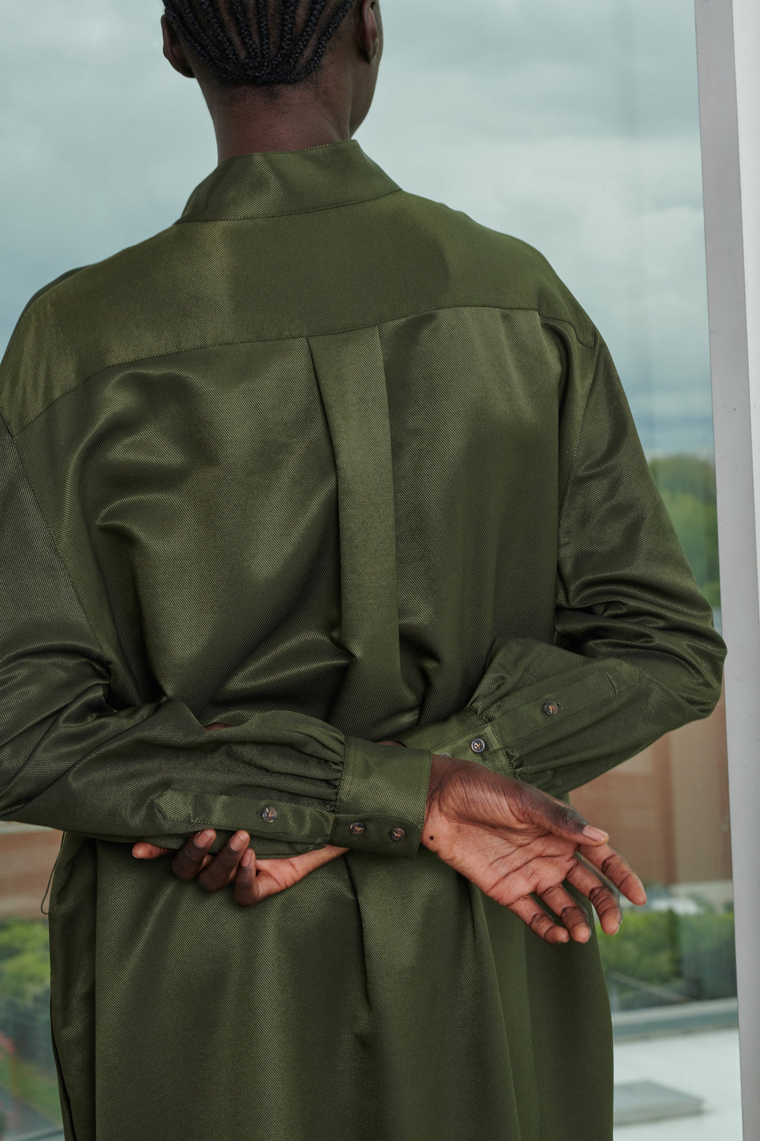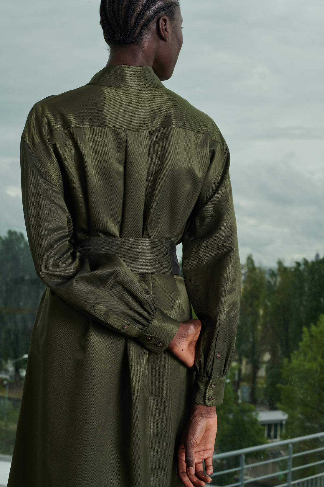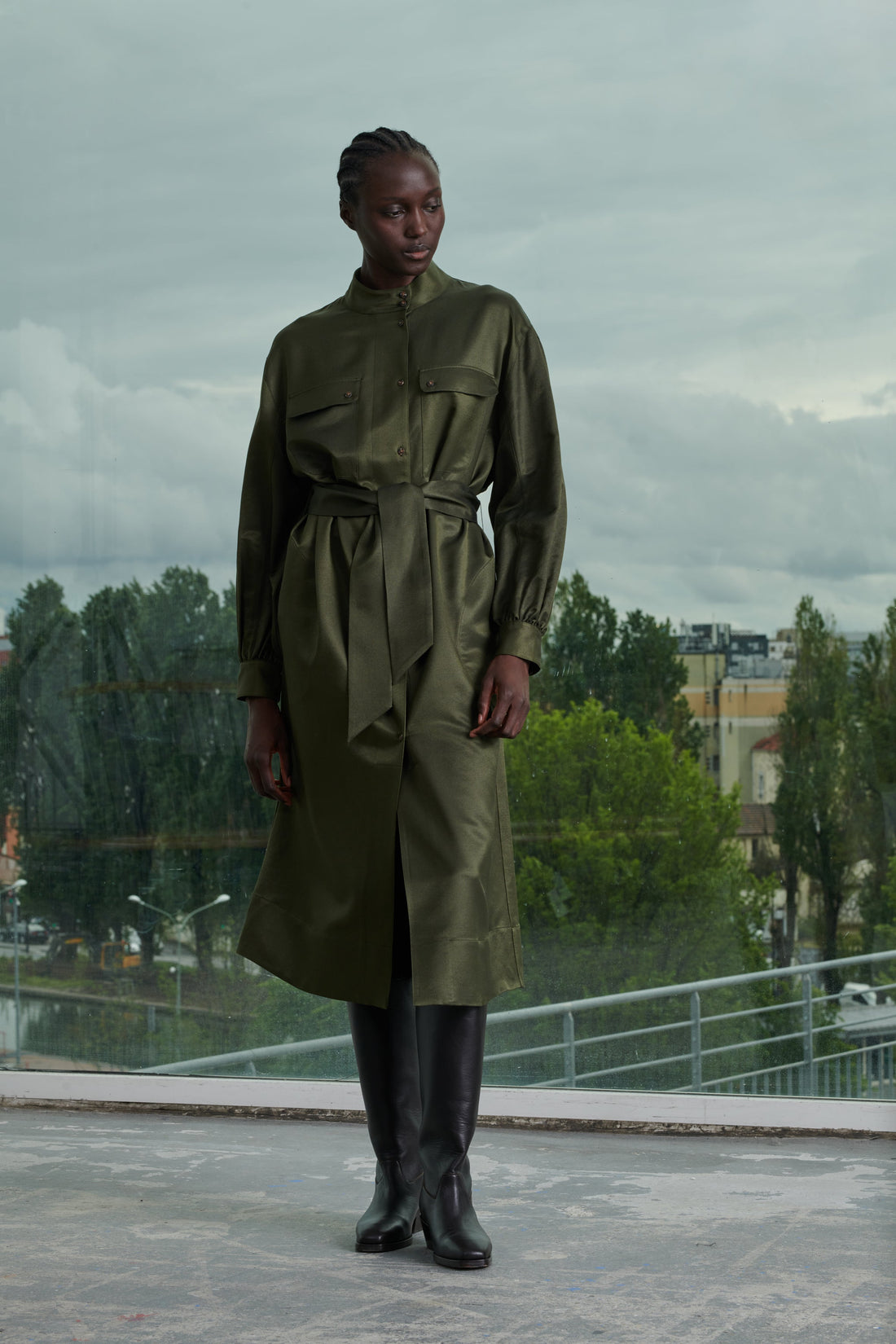 VEDA est une robe longue en lainage fin et souple. ICi, son col peut se porter montant ou défait pour révéler le cou. Cette version en soie et laine a des reflets légèrement dorés.
