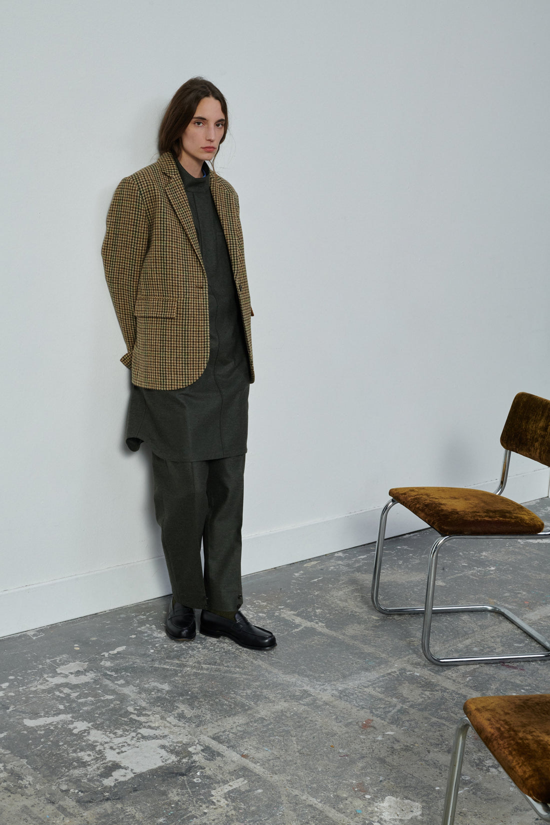 VENTURA est une robe courte en lainage fin et souple. Le pied de col légèrement montant peut se porter boutonné ou boutons défaits pour révéler le cou.
