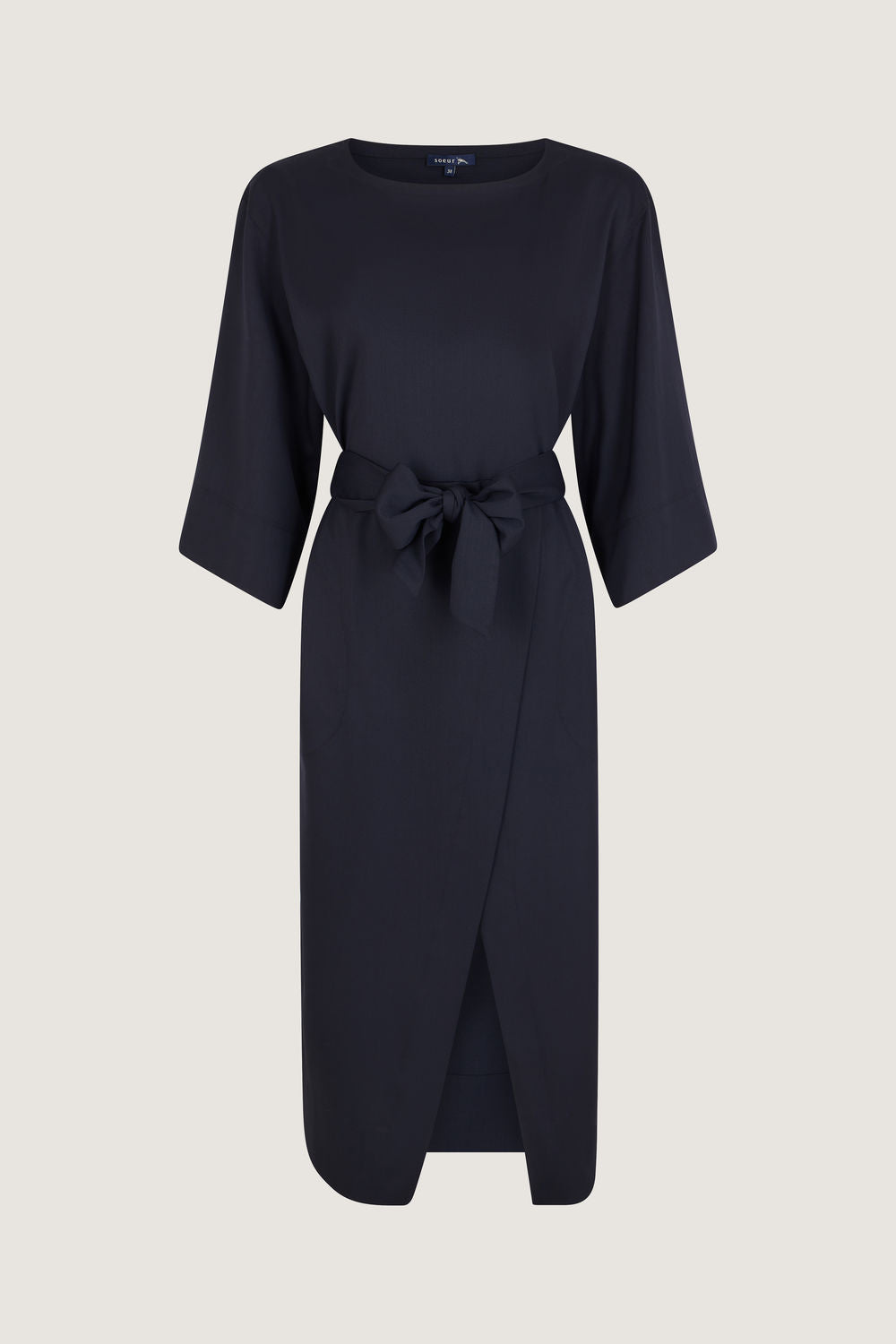 Robe en gabardine de laine légère - Encolure bateau- Manches 3/4- Ceinture dans la matière amovible Cette pièce est certifiée OEKO-TEX Standard 100.