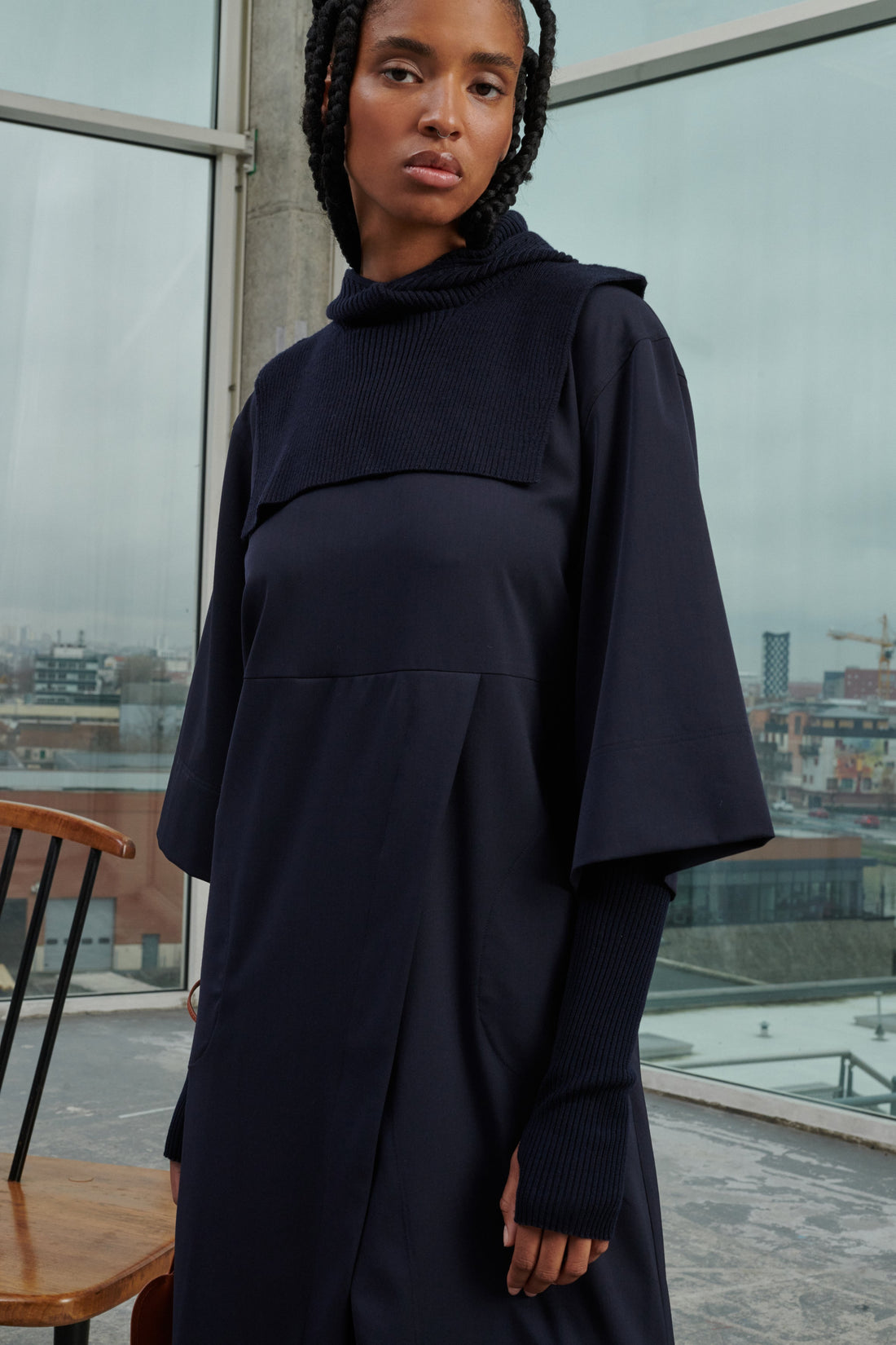 VERCORS est une robe longue en lainage fin et souple. Cette robe portefeuille est en fait un trompe-l'œil, le pan étant fixé au niveau de la ceinture. La taille haute est marquée mais peut être agrémentée d'une ceinture amovible à nouer selon ses envies.