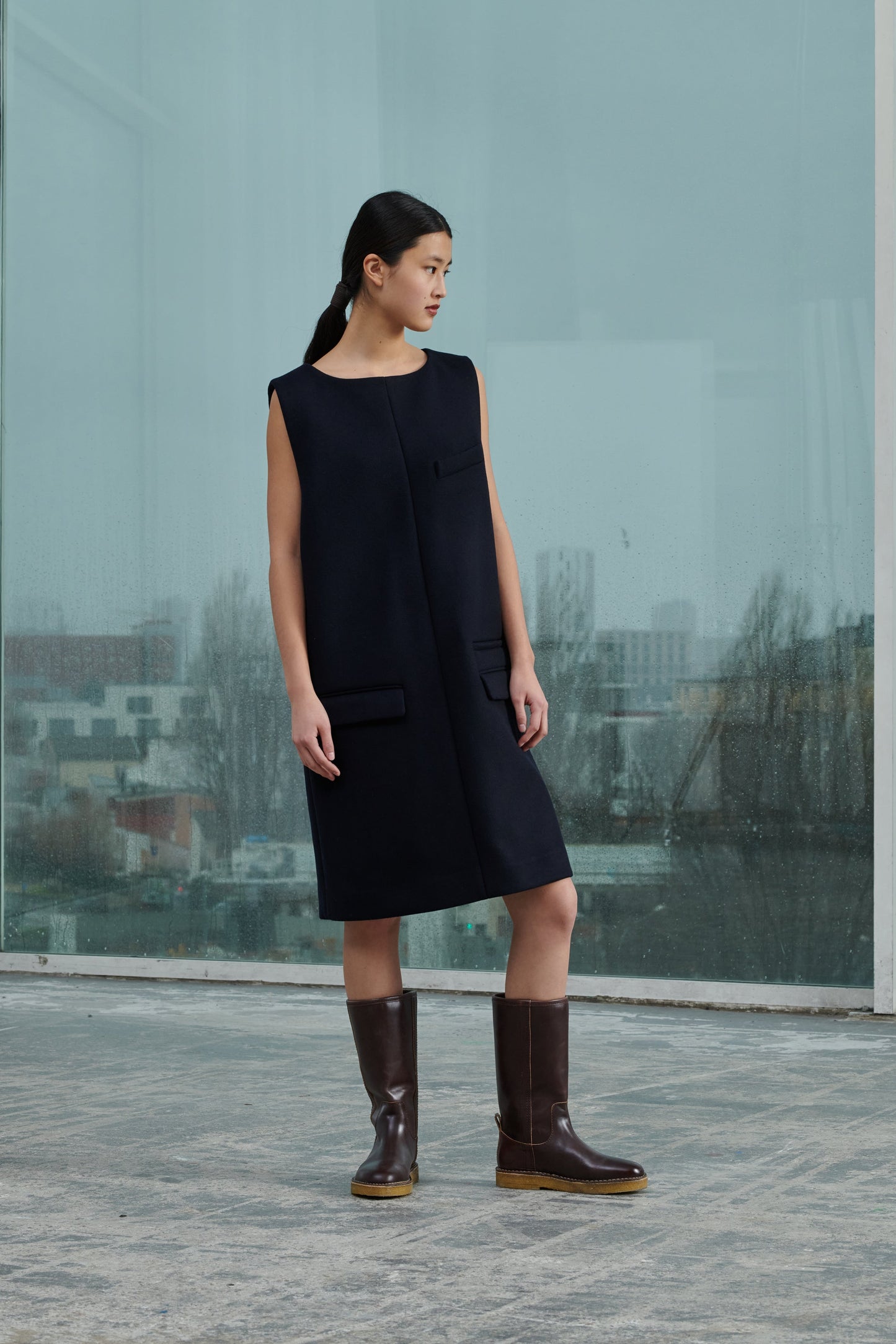VERONIQUE est une robe sans manche (dite "trois trous"). Cette pièce, très particulière, est confectionnée dans un drap de laine épais et chaud, tissu traditionnellement réservé aux manteaux d'hiver.