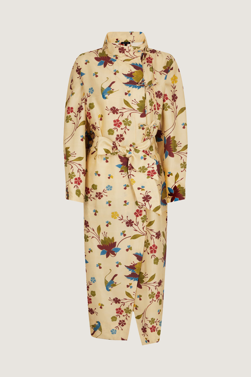 Robe à liens en doupion de soie imprimé - Coupe longue et volume droit, se porte avec ou sans ceinture- Col large et tombant- Système de lien décoratif- Boutonnage caché au milieu devant jusqu’au mi-cuisses- Manches longues larges avec système de boutonnage aux poignets- Fente au milieu devant- Ceinture amovible